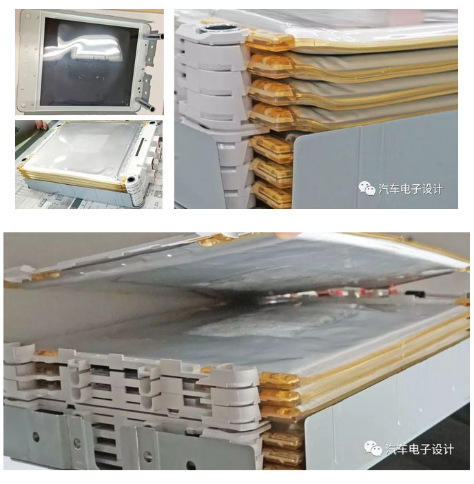 電芯表面也通過膠水進行固定,某種程度上現(xiàn)在的VDA軟包又回到了類似LEAF這樣的初始設(shè)計考慮,以進行模組的輕量化考慮。