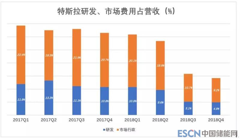 特斯拉披露,2018年裁員成本為2730萬美元并,將在2019年大量關(guān)閉線下門店,只保留交通要道的個別門店用于展示并提供咨詢。這些舉措意味著市場費用的進(jìn)一步壓縮。