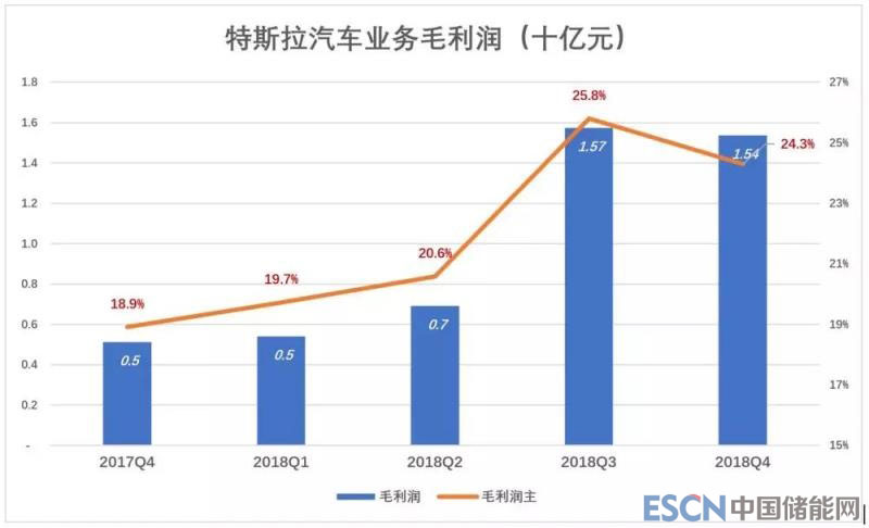 2018年H2,特斯拉低端產(chǎn)品Model 3放量交付,但公司毛利潤率不降反升,Q3、Q4汽車業(yè)務(wù)毛利潤分別為15.7億美元和15.4億美元,毛利潤率分別為25.8%和24.3%。全年毛利潤43.4億美元,較2017年增長96.5%。