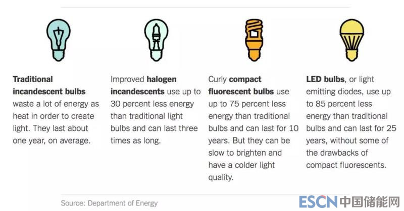 那么,美國的鹵素白熾燈、CFL燈、LED燈這些年來的發(fā)展如何,占多大比例呢?根據(jù)紐約時(shí)報(bào)的報(bào)道,2016年傳統(tǒng)燈泡僅占美國家庭照明燈具的6%、鹵素白熾燈占37%、CFL燈占44%,而LED燈占14%。