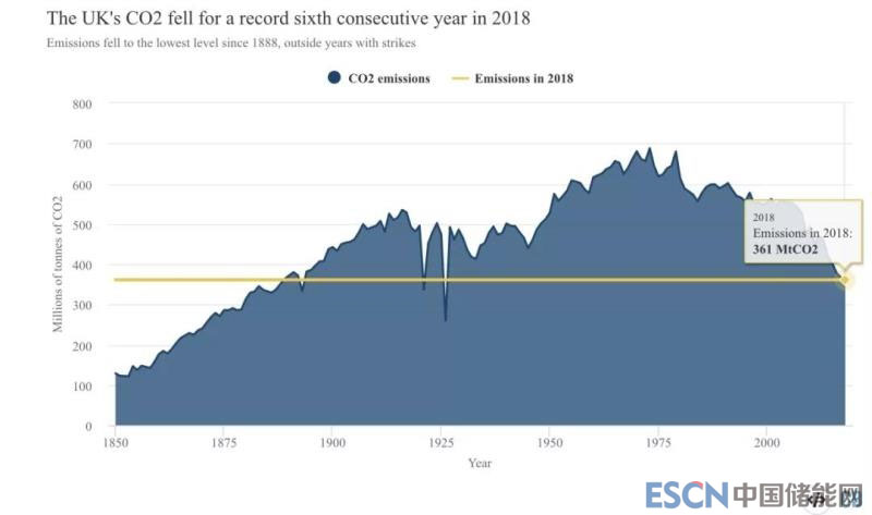 中國儲能網(wǎng)訊:根據(jù)英國Carbon Brief機(jī)構(gòu)的評估,英國2018年碳排放為3.61億噸,比1973年的排放峰值6.88億噸下降47.5%,相當(dāng)于1889年的排放水平。從人均碳排放水平來看,2018年英國人均碳排放為5.4噸,是1858年以來的最低水平。