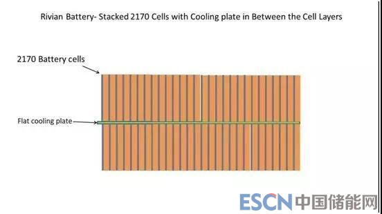 Rivian的動力電池模組采用了上下兩層的結構,總共由864個電池單體組成,每層放置432個單體,其熱管理系統(tǒng)的解決方案是在兩層電池單體之間放置一塊7mm厚的冷卻板,泠卻液在內(nèi)部循環(huán),從而達到控制動力電池工作溫度的作用。