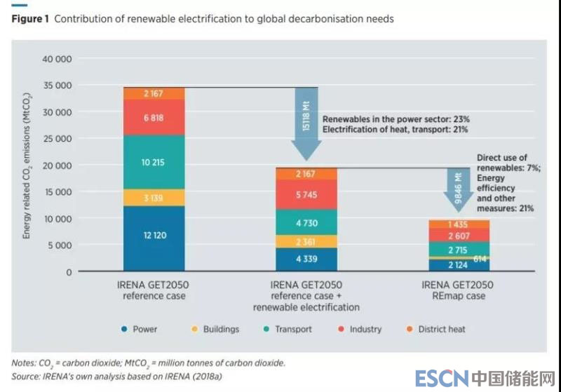 雖然電力消費在增加,但是減少了總能量需求,如電氣化的供熱和運輸系統(tǒng)的效率高于化石燃料。IRENA認為全球范圍內建筑物用能電氣化的潛力最高(2050年可達50-80%),其次是工業(yè)部門(34-52%),然后是運輸部門(10-52%)。IRENA預測,2050年全球可以使用十億輛電動汽車,使用熱泵的供暖的建筑物可能會增加十倍,數量可能超過2.5億臺。