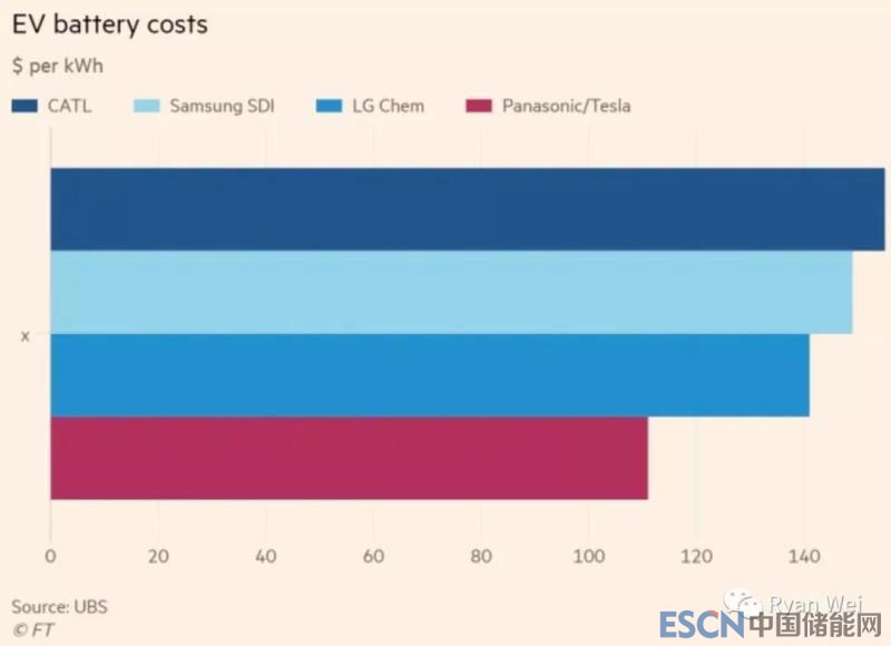 UBS一位分析師Colin Langan去年11月對(duì)全球主要四家電動(dòng)車(chē)電池價(jià)格做了成本拆解分析,特斯拉和松下合作生產(chǎn)的21700NCA圓柱鋰離子電池的價(jià)格(111usd/Kwh)比LG化學(xué)的軟包三元鋰電池低~25%(148usd/Kwh),而LG化學(xué)的電池在其余三家里是價(jià)格最低的,其余三家包括LG化學(xué),三星SDI和CATL寧德時(shí)代新能源。