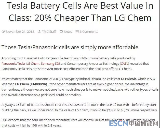 特斯拉和松下合作生產(chǎn)的是21700 NCA圓柱電池,不含鈷,比其他主要電池廠(chǎng)家目前主要采用的三元鎳鈷錳便宜可以預(yù)期。長(zhǎng)期看空特斯拉的UBS給出111usd/Kwh的電池成本,馬斯克一直指責(zé)對(duì)方低估??磥?lái)特斯拉的電池成本已是降幅明顯。