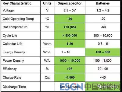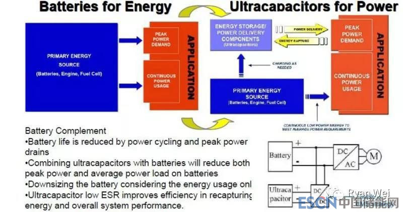 超級(jí)電容器在功率密度、高低溫性能、壽命、可靠性和安全性(無(wú)熱失控)等方面相對(duì)于電池有明顯的性能優(yōu)勢(shì)。超級(jí)電容器和電池在應(yīng)用上更多是互相補(bǔ)充的關(guān)系,把二者的長(zhǎng)短處補(bǔ)充起來(lái)用,可以彌補(bǔ)彼此的一些缺陷,一般電池起主要作用,超級(jí)電容器起輔助作用。