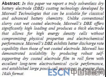 用干法電極技術(shù)制造超級(jí)電容器成功應(yīng)用已經(jīng)多年,近幾年探索把干法電極技術(shù)應(yīng)用于鋰電池電極制造,并有了初步驗(yàn)證結(jié)果。所以Maxwell的技術(shù)具備promising & good potenal的條件。
