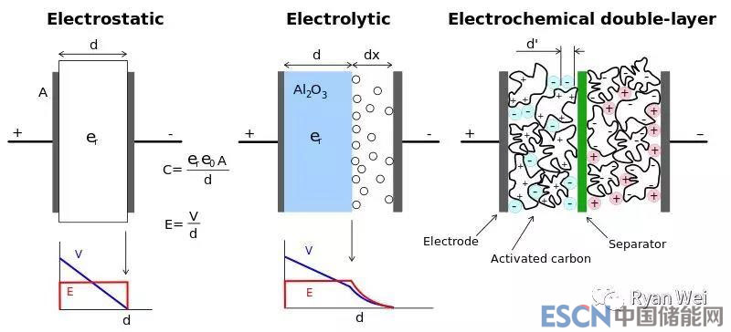超級(jí)電容器與電池一樣是一種電能存儲(chǔ)裝置,主要以活性炭作為活性物質(zhì),通過(guò)雙電層吸附電荷的原理進(jìn)行儲(chǔ)存電量。二者最大的差異是存儲(chǔ)反應(yīng)機(jī)理不同,超級(jí)電容器是純粹的物理反應(yīng),電荷吸附儲(chǔ)能;而電池是化學(xué)反應(yīng),比如鋰電池,充放電有嵌鋰脫鋰的化學(xué)反應(yīng)。由此帶來(lái)二者的性能最大差異:超級(jí)電容器能量密度低而功率密度高,電池的能量密度高而功率密度低。