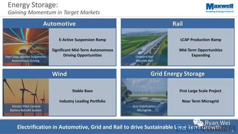 Maxwell的超級(jí)電容器產(chǎn)品主要供給風(fēng)能、電動(dòng)車(chē)、軌道交通、電網(wǎng)儲(chǔ)能、航空航天、儀器儀器、工業(yè)及設(shè)備等行業(yè)。
