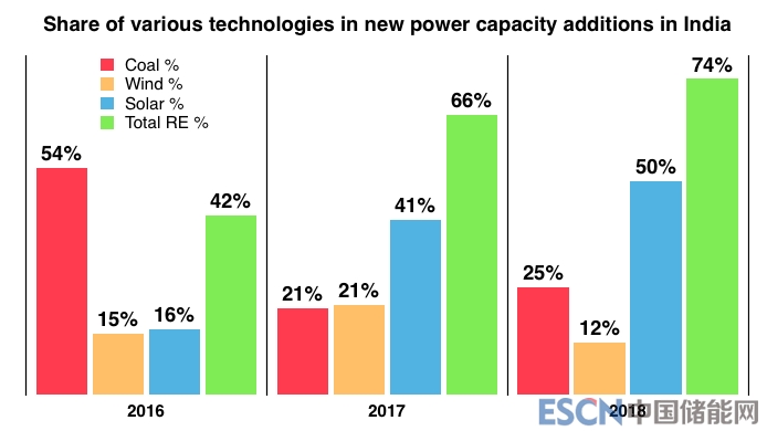 中國儲能網(wǎng)訊:根據(jù)印度最新統(tǒng)計數(shù)據(jù)顯示,印度在2018年增加了17.6吉瓦的總發(fā)電量(凈),其中74%基于可再生能源技術(shù)(主要是太陽能發(fā)電),創(chuàng)下歷史新高,至此,2018年成為迄今為止新增產(chǎn)能最環(huán)保的一年。