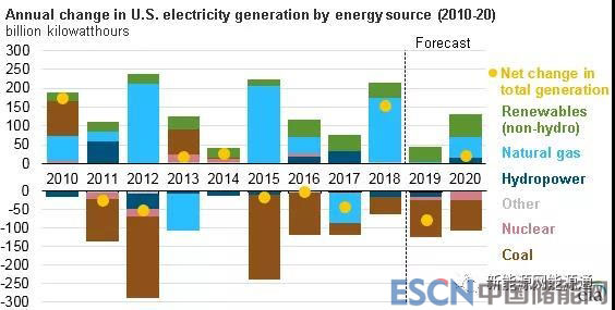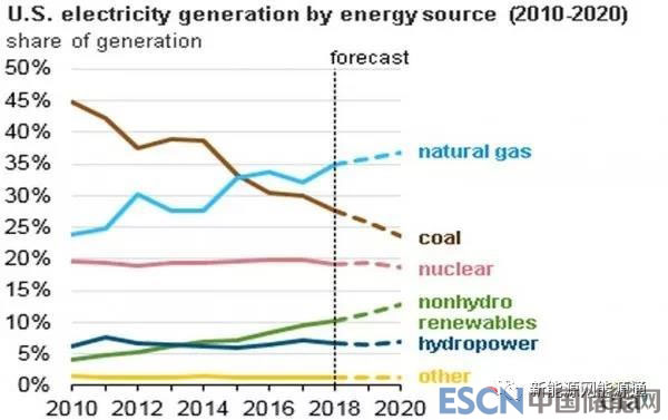 即使可再生能源的增長,化石燃料仍將為美國提供大部分電力。2018年,煤炭和天然氣合計(jì)提供了63%的電力,EIA預(yù)測2020年將提供61%。