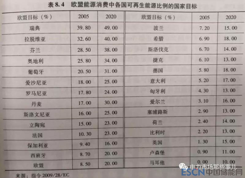 各國可再生能源比例分解目標(biāo)為[5]: