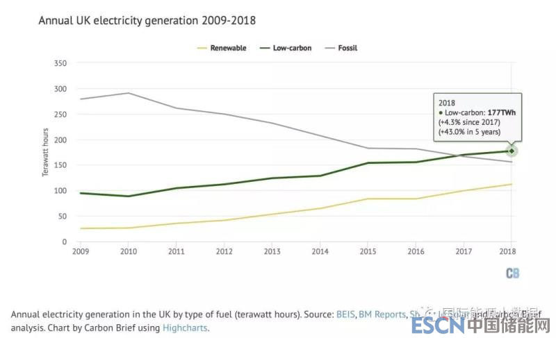 與此同時(shí),2018年可再生能源的產(chǎn)量再次創(chuàng)下歷史新高,2018年占英國(guó)總產(chǎn)量的33.4%(風(fēng)電17.4%、生物質(zhì)10.7%、太陽(yáng)能3.8%、水電1.5%)。包括核電(19.4%)在內(nèi),2018年低碳能源占英國(guó)發(fā)電量的52.8%,來(lái)自化石的份額燃料處于歷史最低點(diǎn)(天然氣39.4%、煤電5.1%、其他2.8%)。