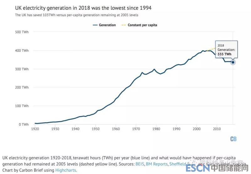 中國(guó)儲(chǔ)能網(wǎng)訊:根據(jù)Carbon Brief匯總的數(shù)據(jù),由于需求的下降,2005年英國(guó)發(fā)電量達(dá)峰以后連年下降,2018年英國(guó)發(fā)電總量約為3350億千瓦時(shí)(335TWh),是25年來(lái)的最低水平,相當(dāng)于回到1994年(326TWh)。