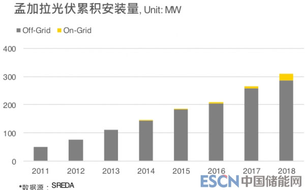 目前孟加拉總體安裝量為325.82MW,其中離網(wǎng)項(xiàng)目每年需求皆有穩(wěn)定的成長(zhǎng),截至2011-2018年平均每年新增約35MW的安裝量,累積安裝量至今已達(dá)286.72MW,占總體安裝量的88%。并網(wǎng)項(xiàng)目截至目前累積安裝量?jī)H39.1MW,占總體安裝量的12%。