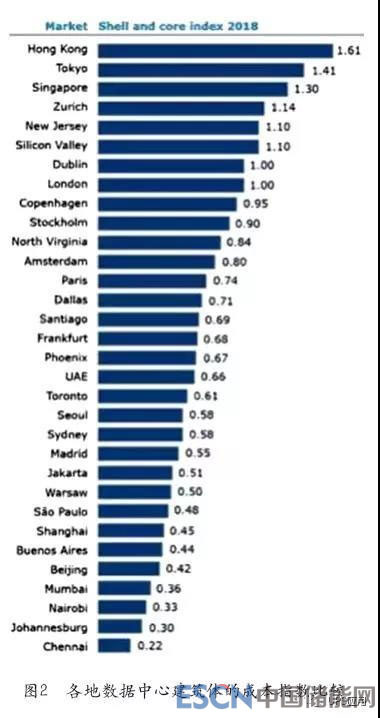 Turner&Townsend也公布了各地數(shù)據(jù)中心建筑體的成本指數(shù)比較(見圖2):上海和北京依然可以排列為全球最具成本競爭力的數(shù)據(jù)中心目的地之一。中國具備相對有競爭力的勞力成本,也是很多數(shù)據(jù)中心機(jī)電設(shè)備的原產(chǎn)地,也令本地建設(shè)成本更具競爭力。
