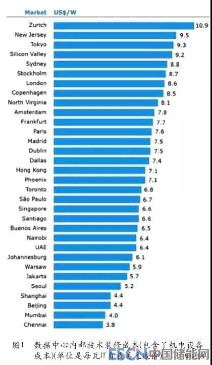 中國儲能網(wǎng)訊:國際著名的建筑咨詢服務(wù)企業(yè)Turner&Townsend調(diào)查了在全球32個不同區(qū)域建設(shè)數(shù)據(jù)中心的建設(shè)成本。該調(diào)查的設(shè)定場景是建設(shè)30MW超大型數(shù)據(jù)中心新建建筑(greenfield)的成本。成本中,包括了建筑材料、設(shè)備、及人工費(fèi)用,見圖1。