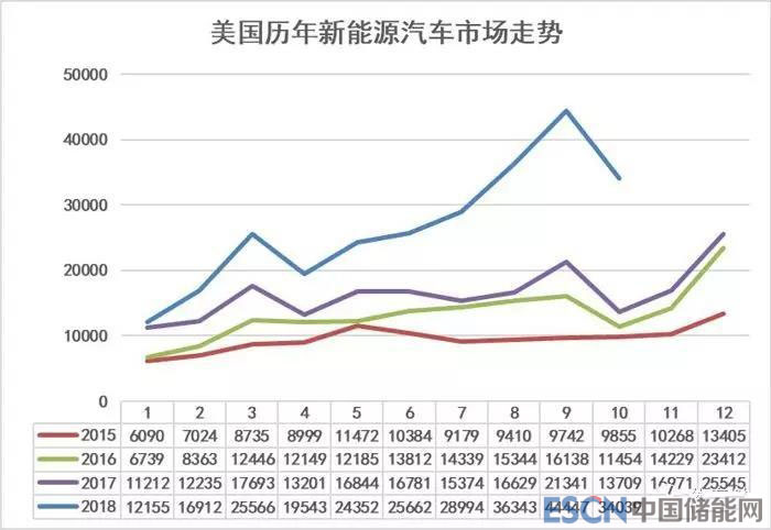 自2011年1月以來,美國市場已累計(jì)售出超過99萬輛電動汽車,而僅在2018年第三季度就銷售了11萬輛電動汽車,與2017年同期相比顯著增長了108%。從下圖2015年以來的美國新能源汽車走勢,也可以看到,當(dāng)?shù)匦履茉词袌霾⑽赐?