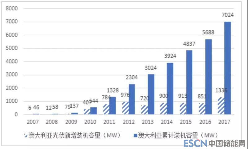 2017年澳大利亞新增光伏裝機容量約為1336兆瓦,位列全球第七,比2016年(851兆瓦)增長57%;其中家庭屋頂光伏占64%,商業(yè)部門光伏占18%,其余為大型地面光伏電站。