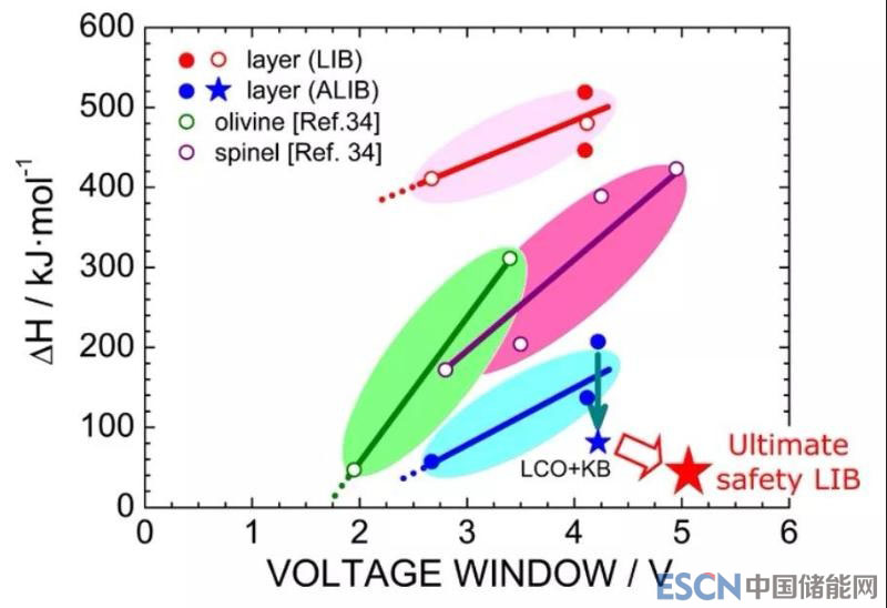 作者根據(jù)DSC測(cè)試結(jié)果(截至420 ℃)和工作電壓窗口繪制了圖4。可以看出,即使使用不同的電解液或固態(tài)電解質(zhì),全電池反應(yīng)焓同正極材料的工作電壓正相關(guān)。全固態(tài)電池產(chǎn)熱量只有鋰離子電池的25-30%,因此具有顯著的安全性?xún)?yōu)勢(shì)。盡管KB的加入使反應(yīng)焓降低至16%左右,但放熱量依然存在,這也表明現(xiàn)有的固態(tài)電池還無(wú)法做到絕對(duì)安全。因此,依然需要努力將放熱量進(jìn)一步降低,實(shí)現(xiàn)真正意義的“安全”。同時(shí)作者也建議要結(jié)合DCS和ARC深入研究鋰離子電池和全固態(tài)鋰離子電池的熱穩(wěn)定性問(wèn)題。