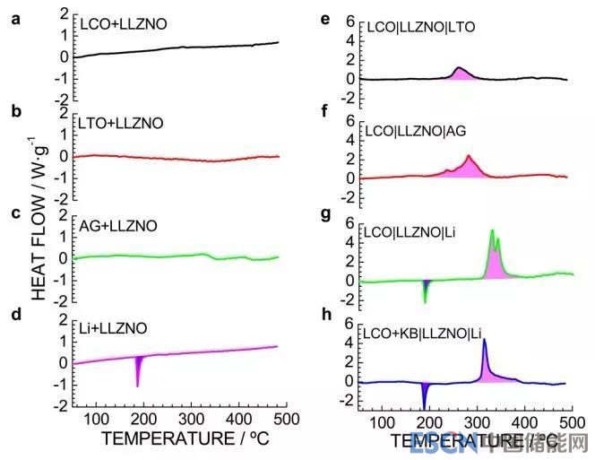 圖3全固態(tài)鋰離子電池DSC分析結(jié)果。溫度范圍為25℃-480℃,升溫速率為5℃/min。所有樣品均含LiPF6 (EC/DEC)電解液。其中AG表示人造石墨(artificial graphite),LCO為鈷酸鋰,LTO鈦酸鋰,LLZNO為鈮摻雜鋰鑭鋯氧固態(tài)電解質(zhì)。