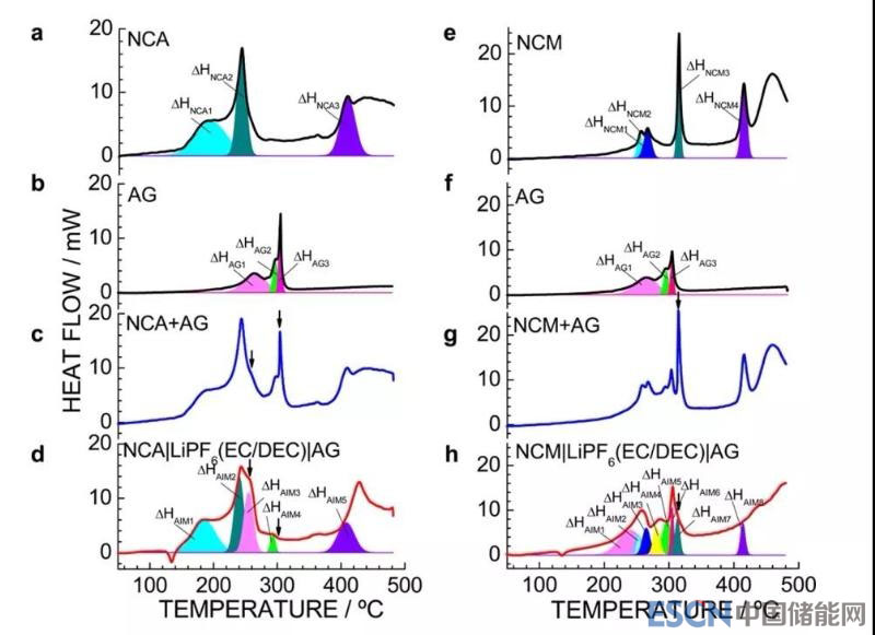 圖2 NCA和NCM體系鋰離子電池DSC分析結(jié)果。溫度范圍為25℃-480℃,升溫速率為5℃/min。所有樣品均含LiPF6 (EC/DEC)電解液。其中AG表示人造石墨(artificial graphite)。