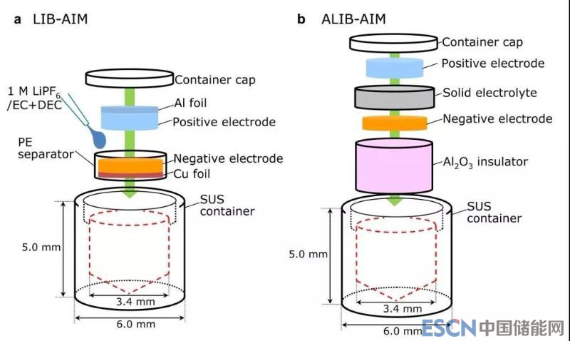 圖1是做鋰離子電池(圖1a)和全固態(tài)電池(圖1b)DCS分析前后準(zhǔn)備的示意圖。其中LIB表示鋰離子電池(lithium ion battery),ALIB表示全固態(tài)鋰離子電池(all-solid-state LIBs),AIM表示all-Inclusive microcell。在鋰離子電池的DSC分析中,為了防止正負(fù)極短路,負(fù)極是卷含在PE隔離膜中的;而在全固態(tài)電池的DSC分析中,并沒(méi)有使用Al箔和Cu箔,且將組裝好的組分是放置在Al2O3管中以防止短路。