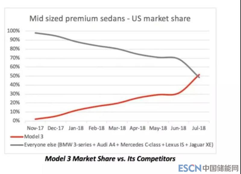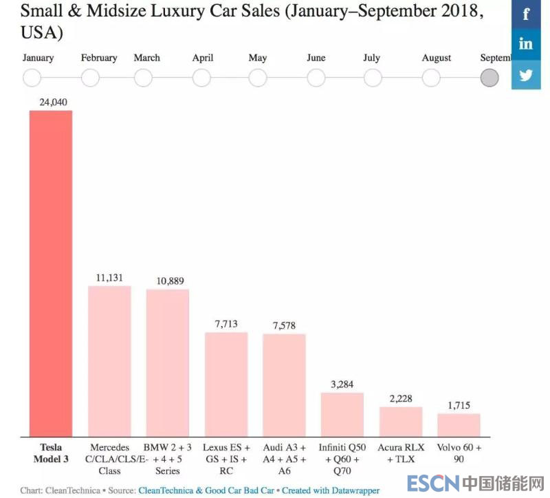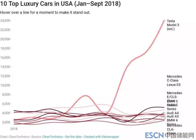 憑借Model 3一款車(chē)型,特斯拉更是將一眾豪華品牌打得落花流水。9月份,Model 3美國(guó)地區(qū)交付量達(dá)到22250輛,單款車(chē)型銷(xiāo)量超過(guò)了BMW 2 + 3 + 4 + 5系和奔馳C/CLA/CLS/E-Class銷(xiāo)量之和。