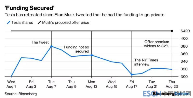 馬斯克將特斯拉私有化的計(jì)劃遭到了多方質(zhì)疑,資金也并未得到真正的落實(shí)。特斯拉的股票開(kāi)始持續(xù)下跌。8 月15 日,SEC 加強(qiáng)了對(duì)特斯拉的調(diào)查力度,向公司發(fā)出了傳票。