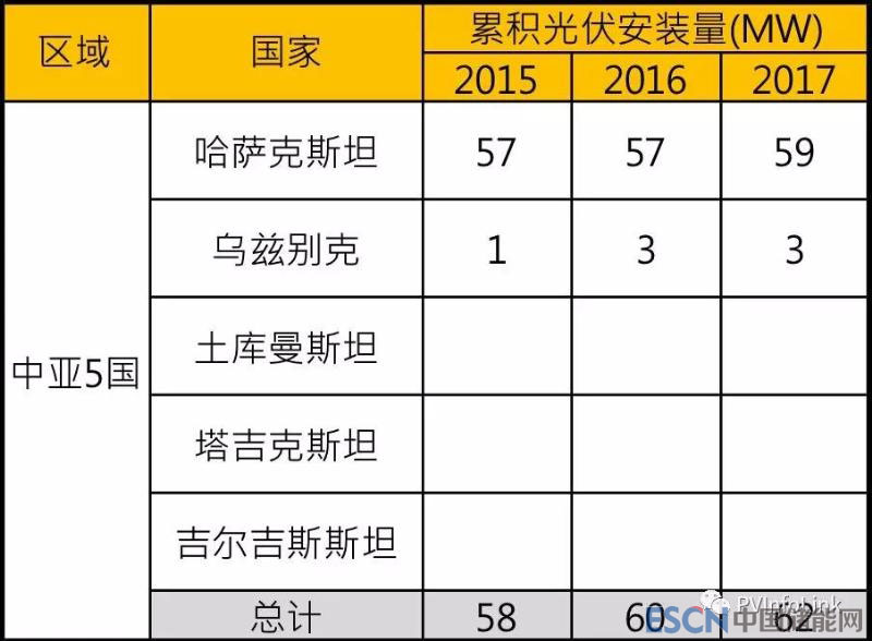 中亞五國整體光伏安裝量累積至2017年僅62MW,目前中亞五國中以哈薩克斯坦的光伏發(fā)展最為突出,2017年累積安裝量達59MW,該國被評估光伏具有占年度整體能源消耗量5%的潛力。