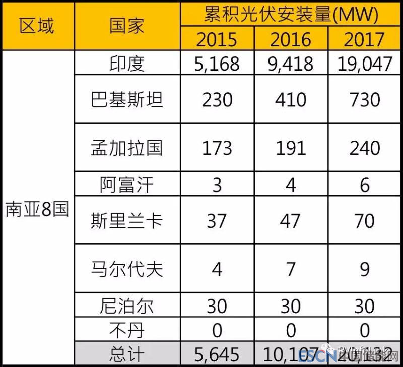 在光伏產(chǎn)業(yè)發(fā)展上,整體南亞地區(qū)2017年累積光伏安裝量達20,132MW,累積光伏安裝量成長率2015-2017年達256.63%,其主要成長動力來源在于印度市場的發(fā)展規(guī)模大且快速,2017年印度市場累積安裝量已達19GW,占2017年南亞地區(qū)整體累積安裝量的94.61%,印度也被譽為可能將超越美國成為全球第二大僅次于中國的光伏市場。