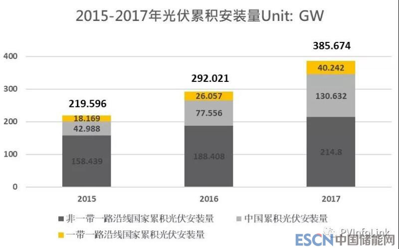 從2015至2017年全球光伏安裝量呈現(xiàn)逐年成長的現(xiàn)象,然而聚焦在一帶一路沿線國家進行探討會發(fā)現(xiàn)2015-2017年這些國家的光伏累積安裝量已從2015年的18GW提高到2017年的40.2GW,光伏累積安裝量成長率達123%遠高于全球光伏累積安裝量成長率75.62%。