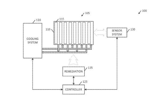 該電池冷卻專利描述了一種新型冷卻系統(tǒng),該系統(tǒng)使用含有兩種不同液體的冷卻劑溶液。兩種液體混合在一起,形成新液體,然后隨著液體混合預(yù)設(shè)比率的變化,混合液體會有不同沸點。冷卻系統(tǒng)的傳感器監(jiān)控電池模塊高壓電解情況,并可自動修復,以降低高壓電解時可能的風險。該專利的目的就是限制單個電池芯和電池模塊可能存在的過熱工況。