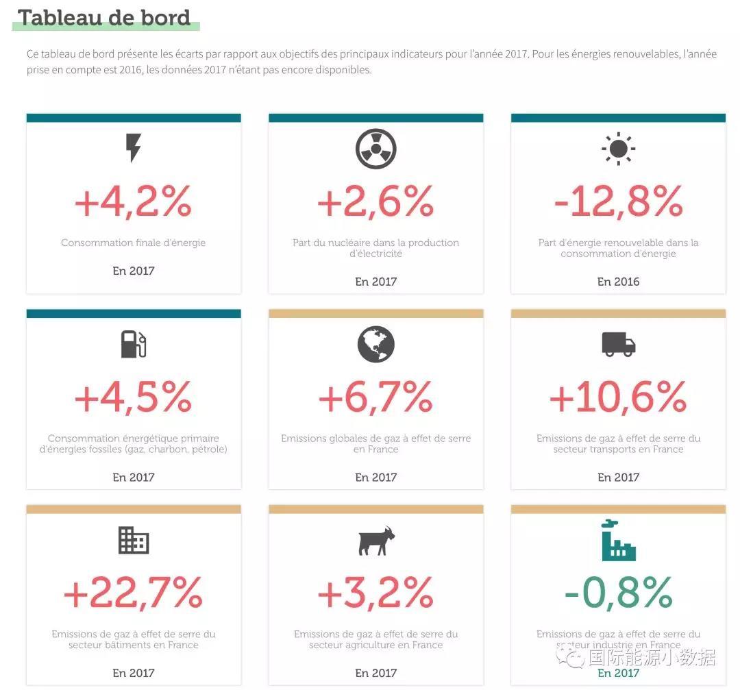 中國(guó)儲(chǔ)能網(wǎng)訊:巴黎協(xié)議簽訂以來(lái),作為應(yīng)對(duì)氣候變化的主要倡導(dǎo)者之一的法國(guó),其減排承諾履行的怎么樣?根據(jù)法國(guó)非政府組織Observatoire Climat Energie匯總的數(shù)據(jù),法國(guó)2017年在9項(xiàng)能源轉(zhuǎn)型和溫室氣體排放相關(guān)的指標(biāo)中有8項(xiàng)惡化,只有工業(yè)領(lǐng)域溫室氣體排放大體持平——