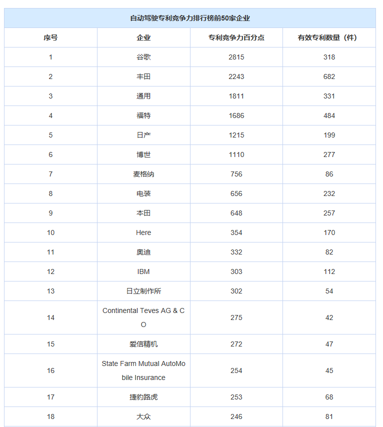 近日,日本權(quán)威媒體與專利分析公司Patent Result合作,出了一份自動駕駛專利競爭力排名,排在第一的是谷歌Waymo、第二是豐田,前十名主要被美國和日本車企所占據(jù)。前50名中沒有中國企業(yè),滴滴出行排在第90位,百度排在第114位。原因在于,雖然申請專利的中國企業(yè)數(shù)量很多,但“尖端專利報告的引用次數(shù)”比較少。