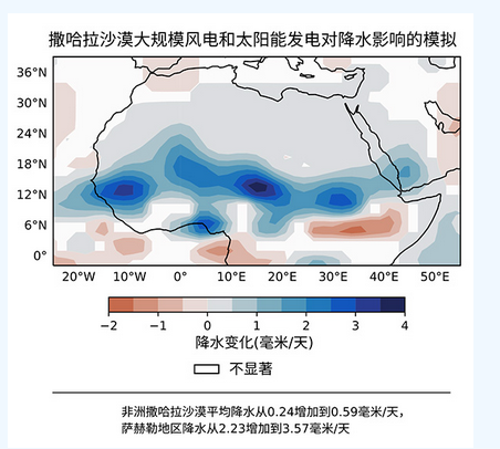 模式模擬結(jié)果發(fā)現(xiàn)風(fēng)電建設(shè)會(huì)帶來區(qū)域溫度升高(+2.16K),日均降水量在風(fēng)電覆蓋區(qū)域平均了增加0.25毫米,相當(dāng)于整個(gè)撒哈拉區(qū)域降水增加一倍。特別在薩赫爾地區(qū),日均降水增加可達(dá)1.12毫米。