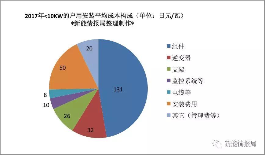 下表顯示了近6年日本市場戶用光伏的平均每瓦的終端用戶價(jià)格,從2012年的280日元/瓦下降到了2017年的131日元/瓦。當(dāng)然MW級(jí)光伏電站與戶用電站的價(jià)格差距肯定是比較大的。
