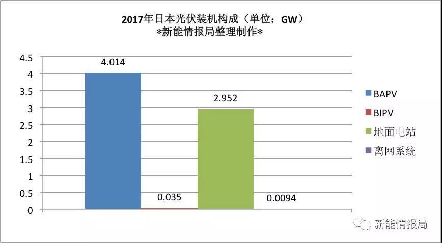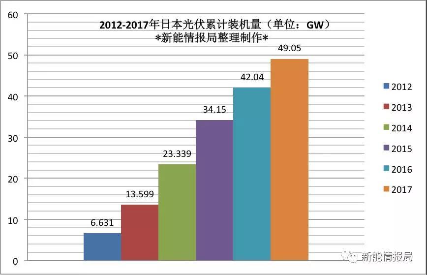 截止2017年底,日本光伏累計(jì)裝機(jī)量為49.051GW,其中并網(wǎng)項(xiàng)目48.88GW,離網(wǎng)項(xiàng)目為0.171GW。而2012年日本光伏累計(jì)裝機(jī)量僅為6.631GW。