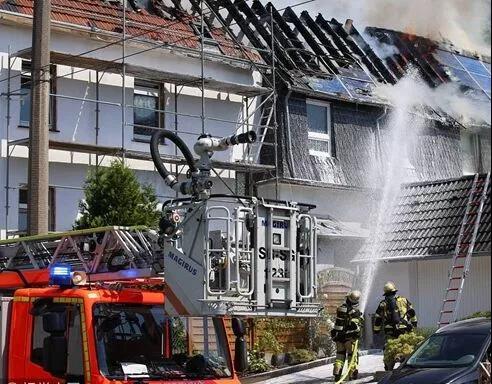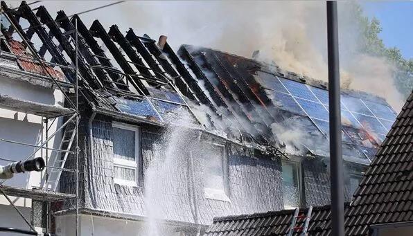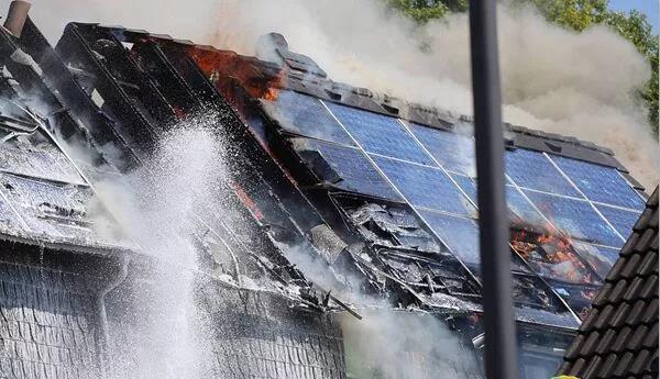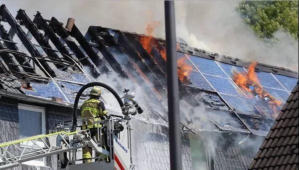 中國儲能網(wǎng)訊:當?shù)貢r間2018年7月26日,德國索林根,當?shù)匾惶幟裾奶柲馨逦蓓斊鸹?,屋頂幾乎全被燒毀?