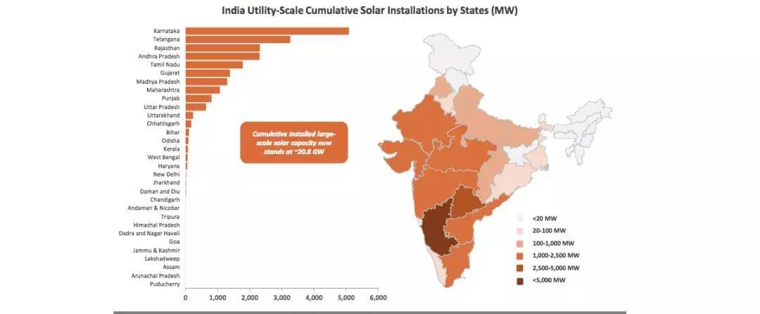 卡納塔克邦累計總裝機量率先超過5GW,Telangana,Rajasthan和Andhra Pradesh分別位列第二,第三和第四名。