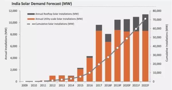 Mercom預計今年將有8到9GW的新增裝機。高于 Bridge to India預測的6GW,低于IHS Markit預期的11GW。