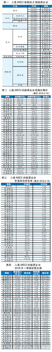 筆者對首批入選MSCI的企業(yè)進行了逐一梳理,結(jié)果發(fā)現(xiàn),此次入選MSCI的能源相關(guān)股有36只(見表一),占比15.38%;其中,綜合能源企業(yè)有3家,分別是申能股份、深圳能源和湖北能源;油氣企業(yè)4家:中國石油、中國石化、上海石化和海油工程;煤炭企業(yè)3家:陜西煤業(yè)、潞安環(huán)能和西山煤電;電力企業(yè)有國投電力、華電國際和華能國際等12家;節(jié)能環(huán)保企業(yè)僅有啟迪桑德1家;新能源企業(yè)有金風科技、天齊鋰業(yè)和隆基股份等13家。