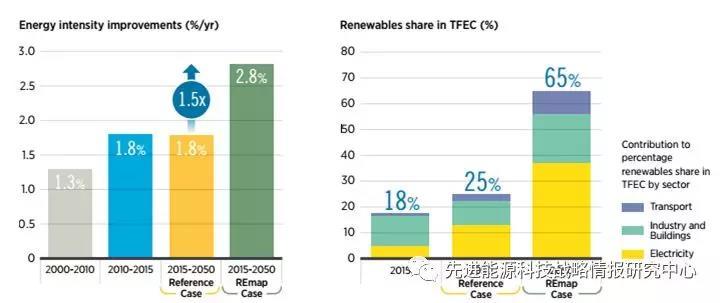 圖2 參考情景和REmap情景中2015-2050年能源強(qiáng)度改進(jìn)率(%/年)、可再生能源在終端能源消費(fèi)所占份額(%)