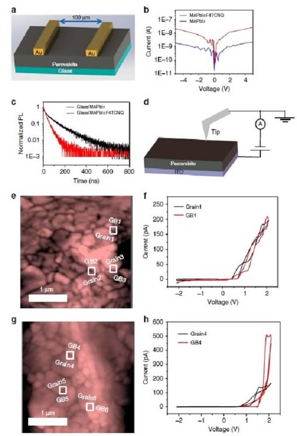 (e-h(huán))無摻雜的鈣鈦礦薄膜的晶粒形貌AFM圖(e)和在晶粒上與晶界上的C-V圖(f);摻雜的鈣鈦礦薄膜的晶粒形貌AFM圖(g)和在晶粒上與晶界上的C-V圖(h)。