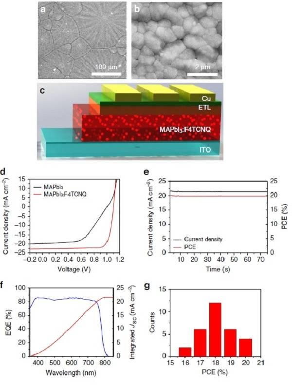 該研究首先利用刮刀涂布法克服了大規(guī)模制備高質(zhì)量鈣鈦礦薄膜難題,然后通過分子摻雜法解決了高效率無空穴傳輸層鈣鈦礦電池的難題。最后器件效率高達20%,并且?guī)缀鯚o遲滯效應(yīng)。該研究為鈣鈦礦太陽能電池商業(yè)化帶來了曙光。