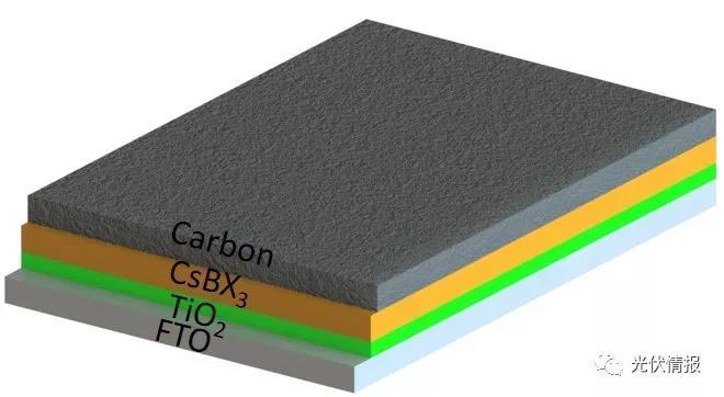 ▲ 新型無(wú)機(jī)鈣鈦礦電池由多層材料組成,底部為僅有幾毫米厚的玻璃,第二層為透明導(dǎo)電材料FTO,上方是由二氧化鈦組成的電子活性層與光敏性(photoactive)鈣鈦礦,最上層則是碳。