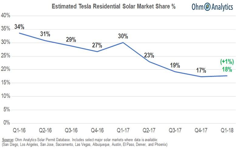 中國儲能網訊:Ohm分析公司的分析報告顯示,繼前幾個季度出現(xiàn)下滑后,2018年一季度,特斯拉的太陽能業(yè)務市場份額有所增長。