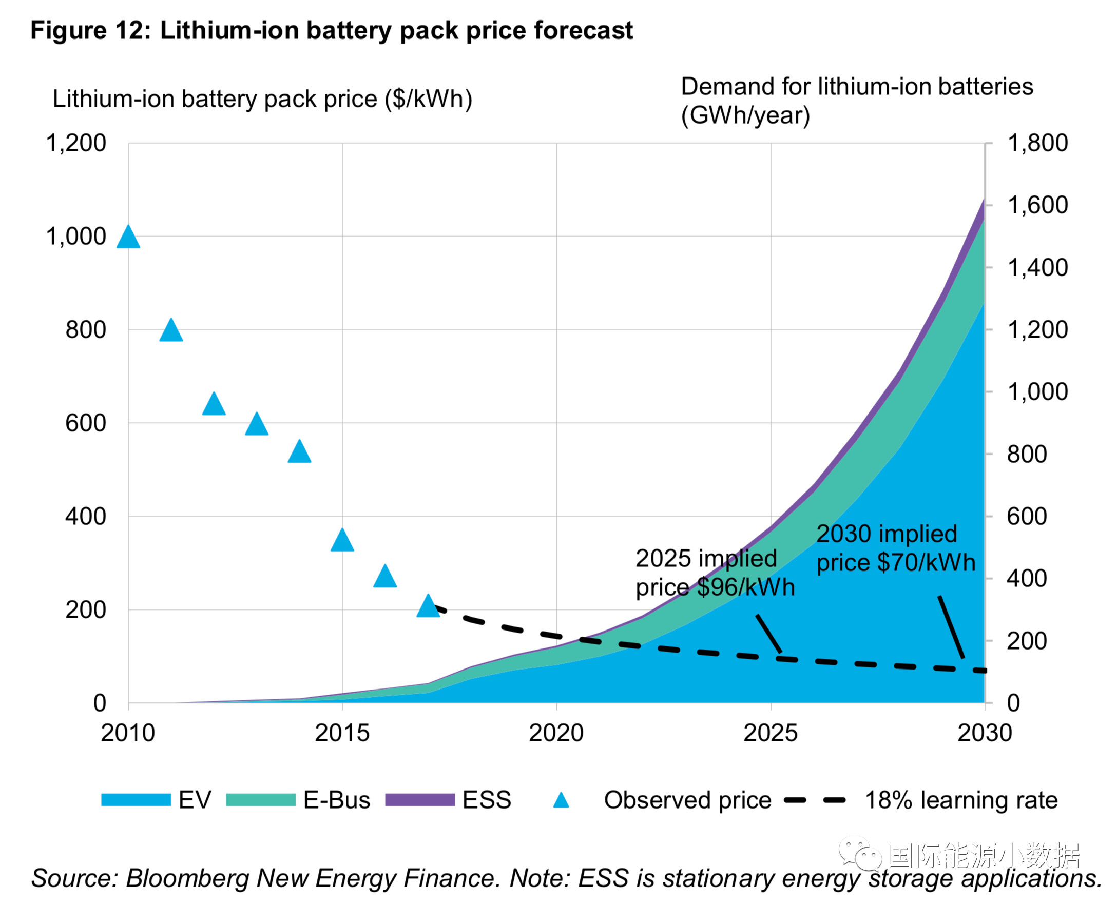 BNEF預(yù)測(cè),2025年鋰電池組的平均成本可降至96美元/千瓦時(shí);2030年將至70美元/千瓦時(shí)。到2030年,全球?qū)︿囯姵亟M的需求可達(dá)16億千瓦時(shí),其中80%將用于電動(dòng)汽車,其余主要用于電動(dòng)大巴車。