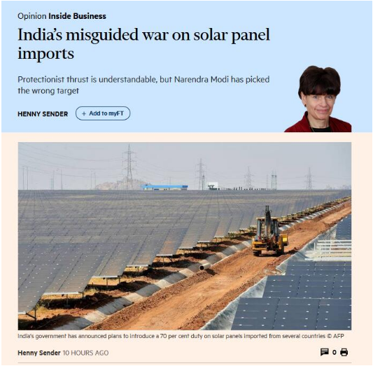 今年1月,莫迪政府卻宣布計劃對從多個國家進(jìn)口的太陽能電池板征收70%的關(guān)稅,其實主要是針對中國。事實上,除少數(shù)例外,印度幾乎沒有自己的太陽能電池板制造業(yè),而莫迪大肆吹噓的“印度制造”也并未真正出現(xiàn),因此印度采取最新的保護(hù)主義政策是可以理解的。