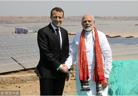 3月,國際太陽能聯(lián)盟首屆峰會曾在德里舉行,莫迪與法國總統(tǒng)馬克龍出席@視覺中國
